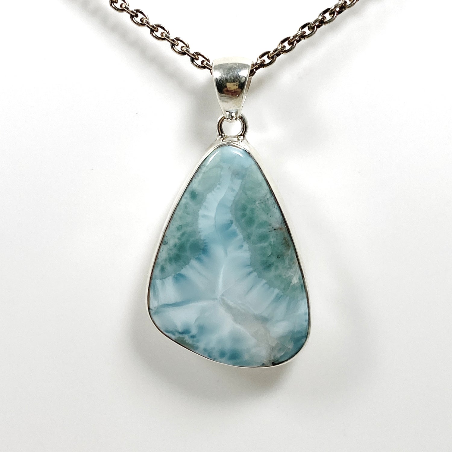 This Larimar Teardrop Pendant is crafted from 925 Sterling Silver and features a unique Larimar stone, known for its brilliant colors and unique patterning.