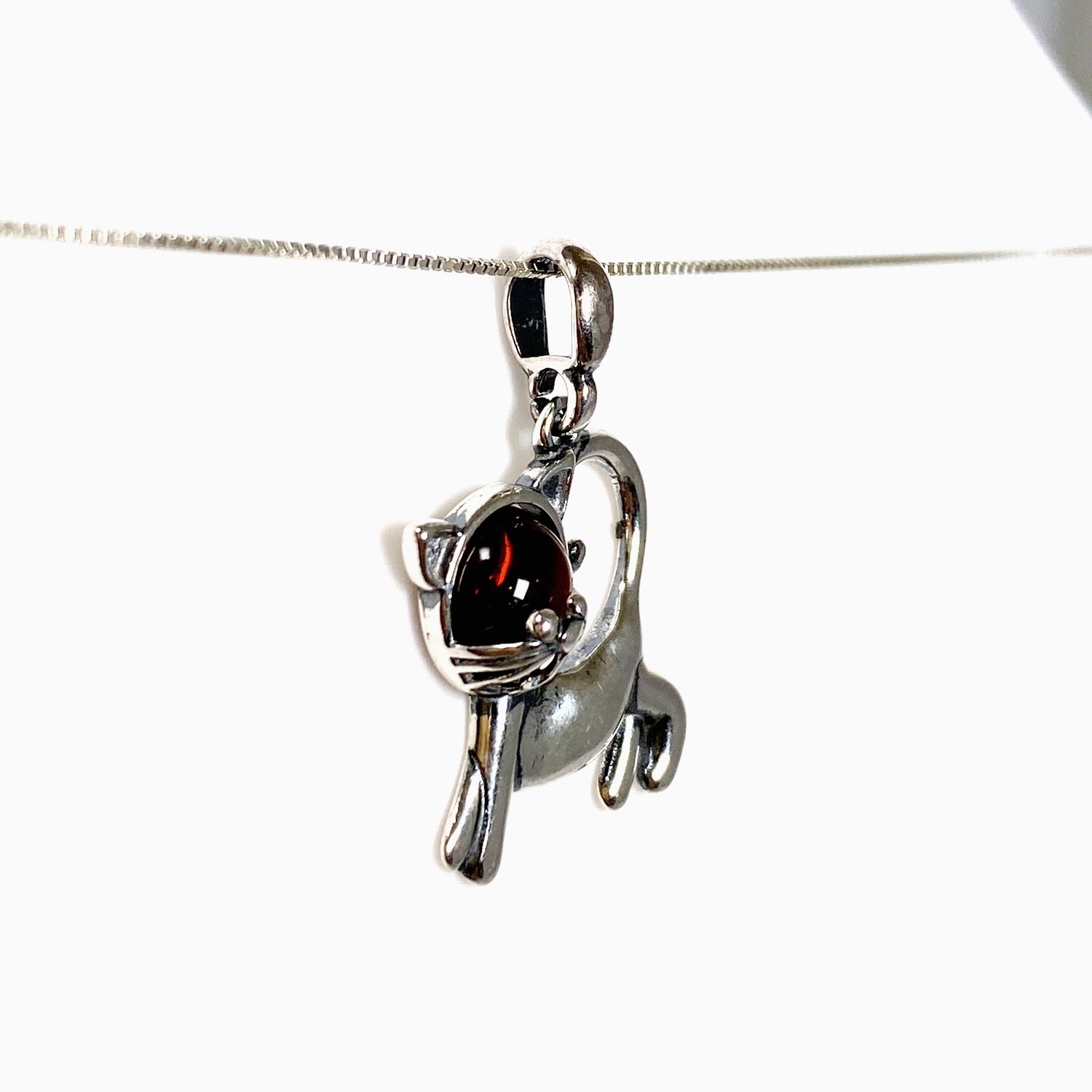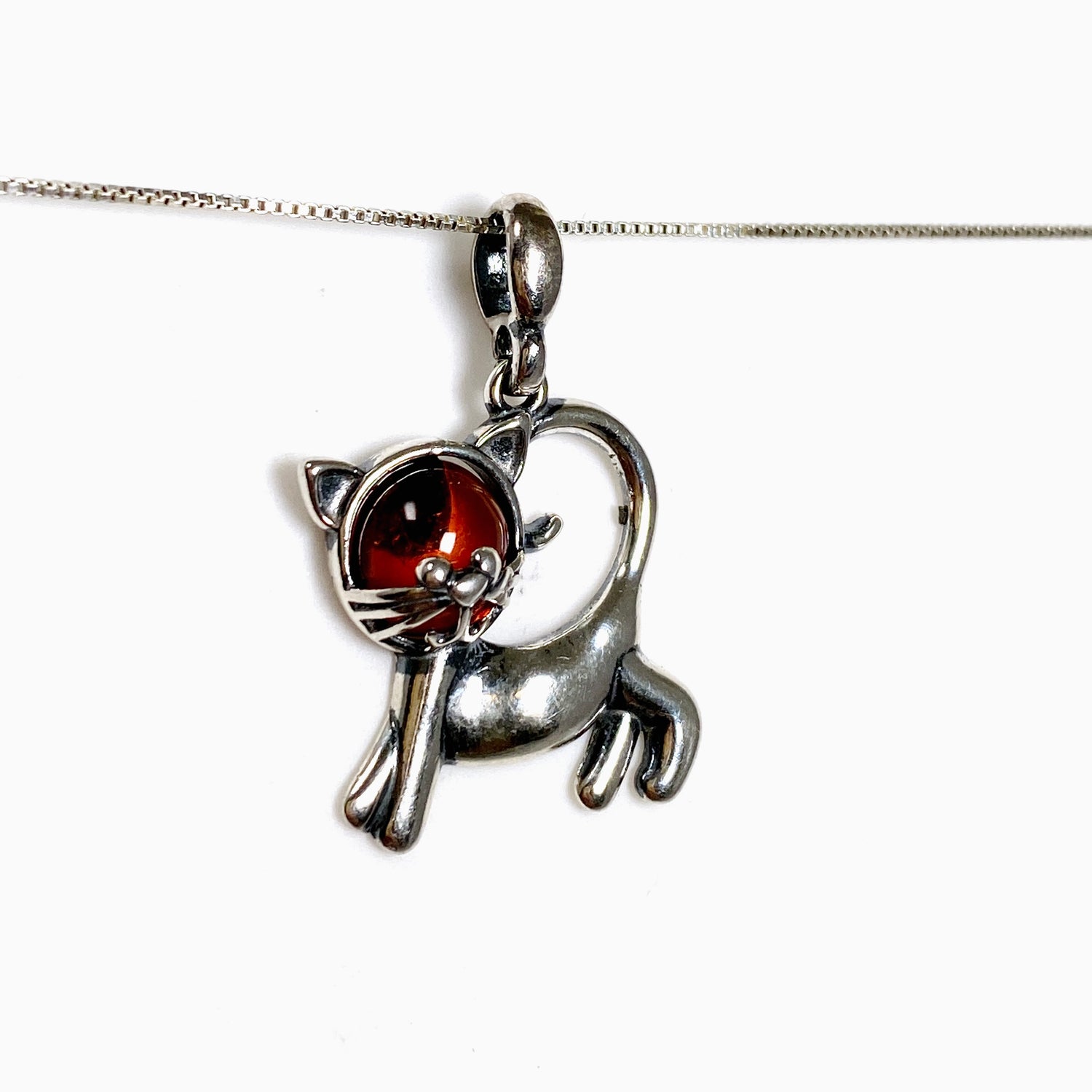 A Baltic Cognac Amber cat pendant in 925 sterling silver, with smooth, polished cabochon amber. Cognac amber is associated with calm, positivity, and emotional balance, while the cat design adds personality and charm. Perfect for cat lovers or as a small, meaningful gift.