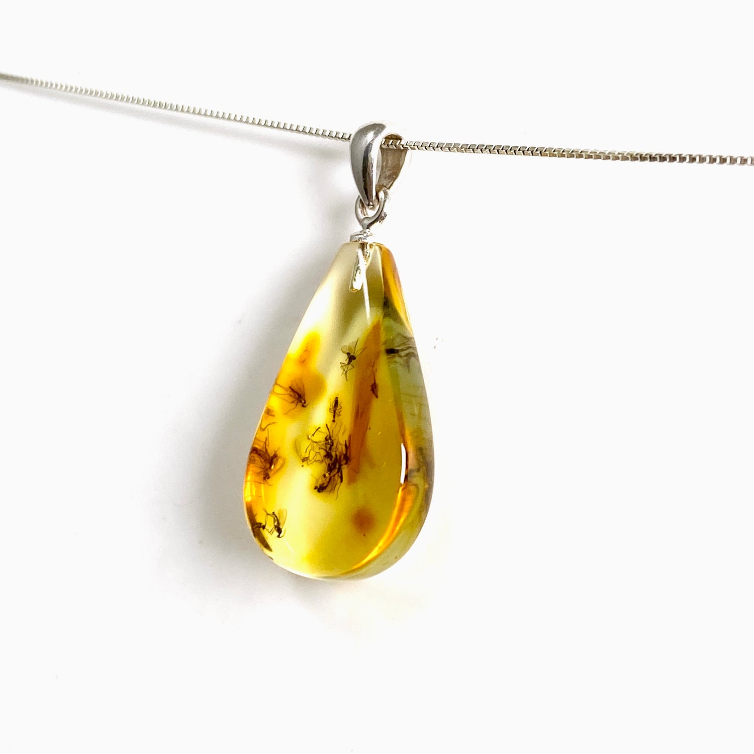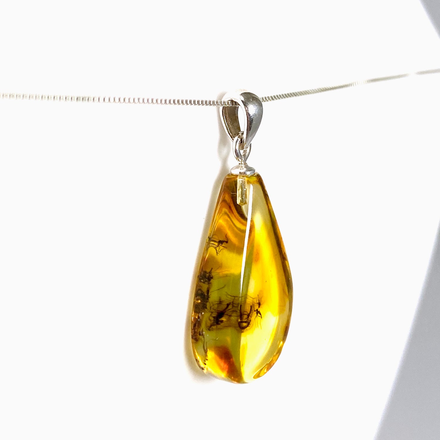 A Baltic Natural Amber teardrop pendant set in 925 sterling silver, showing warm honey tones and natural inclusions. Natural amber is believed to support positivity, emotional clarity, and gentle grounding. Its simple teardrop shape makes it versatile for daily wear or as a thoughtful gift.