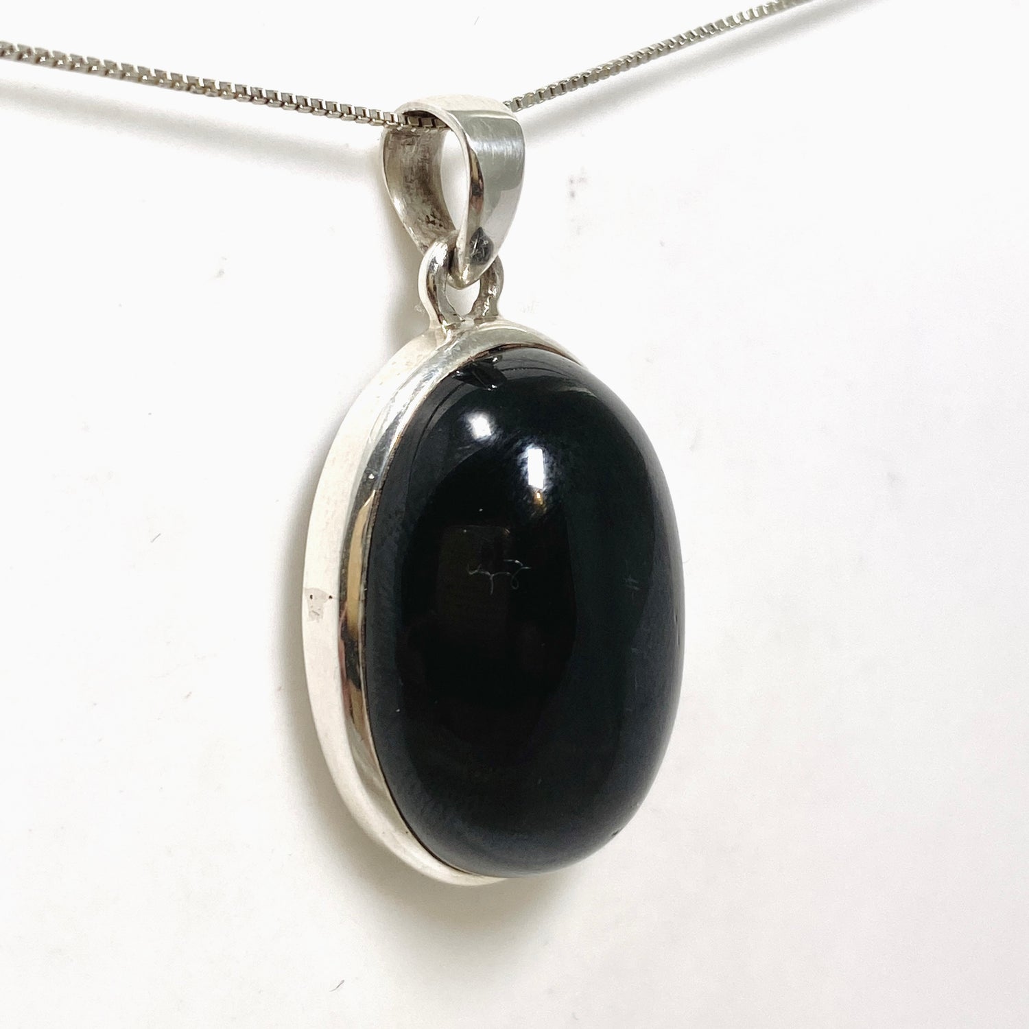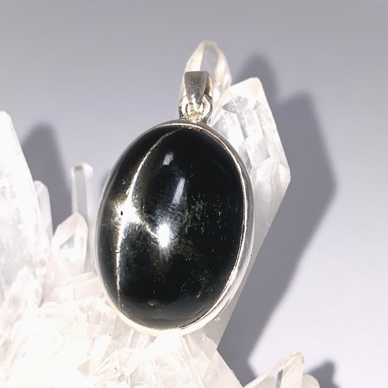 This sterling silver pendant features a polished oval Black Star Diopside cabochon, showcasing its unique asterism—a star-like reflection that appears as the stone catches the light. Black Star Diopside is known for grounding energy, protecting against negativity, and supporting focus and personal strength. Its dark, glossy tone makes it a versatile piece for both everyday wear and layered styling.