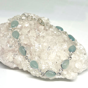 These sterling silver bracelets feature a series of smooth blue chalcedony cabochons, each with a calming, sky-blue hue that evokes a sense of tranquility and peace. Known as the "Speaker’s Stone," blue chalcedony is thought to support clear communication, ease stress, and promote emotional balance. Each cabochon is carefully polished to highlight the stone’s natural soft glow and set in a sleek, minimalist silver design, making this bracelet perfect for everyday wear. Ideal for those who appreciate both beauty and the soothing energy of chalcedony, this piece adds a gentle, serene touch to any look.