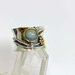 Soothing Blue Chalcedony meets vintage botanical charm in this elegant sterling silver ring. The soft blue tones encourage peace and calm, while the brass leaf detailing adds a unique earthy feel. A beautiful choice for emotional balance. Available in multiple crystal options.