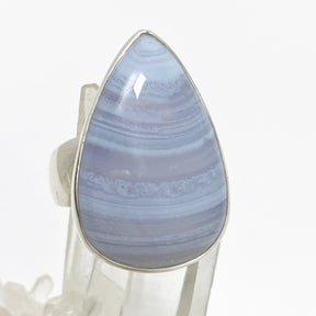 With its elegant teardrop cabochon, this Blue Lace Agate ring is designed to bring a sense of balance and tranquillity. The smooth curves of the stone enhance its gentle energy, making it an ideal piece for those who appreciate both beauty and metaphysical benefits. Set in sterling silver, this ring is perfect for daily wear or special occasions.