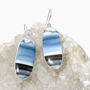 These beautiful sterling silver earrings feature stunning Blue Owyhee cabochons, known for enhancing communication and clarity of thought. Wear these to promote calm and focused expression throughout your day.