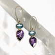 These elegant earrings feature a vibrant pairing of Amethyst and Blue Topaz, blending calm intuition with clear communication. Set in .925 sterling silver, they shimmer beautifully with every movement — perfect for bringing harmony and grace to your day.