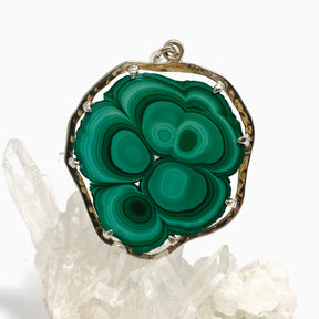 This pendant features a natural freeform slice of malachite, polished to show its vivid green bands and flowing patterns. This piece is entirely unique, revealing the characteristic swirls that malachite is known for. Malachite is often considered a protective stone, helping to absorb negative energy while supporting transformation and personal growth.