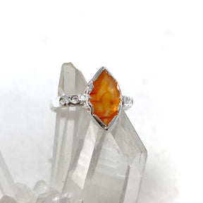 Crafted with a stunning Carnelian stone, this faceted marquise ring boasts a decorative setting for a unique and elegant look. The vibrant color and intricate design make it a perfect accessory for a sophisticated touch to any outfit.