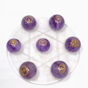 Expertly hand carved and engraved with chakra symbols, this set of amethyst spheres brings balance and harmony to your energy centers. Place them on the included acrylic grid plate for optimal healing and alignment. Own a beautiful, natural tool for enhancing your well-being.
