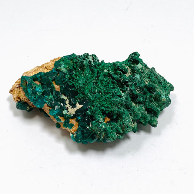 The fusion of Dioptase and Malachite in this specimen creates a truly mesmerising display of colour and texture. Both stones are deeply connected to the heart chakra, working together to support emotional healing and personal growth.