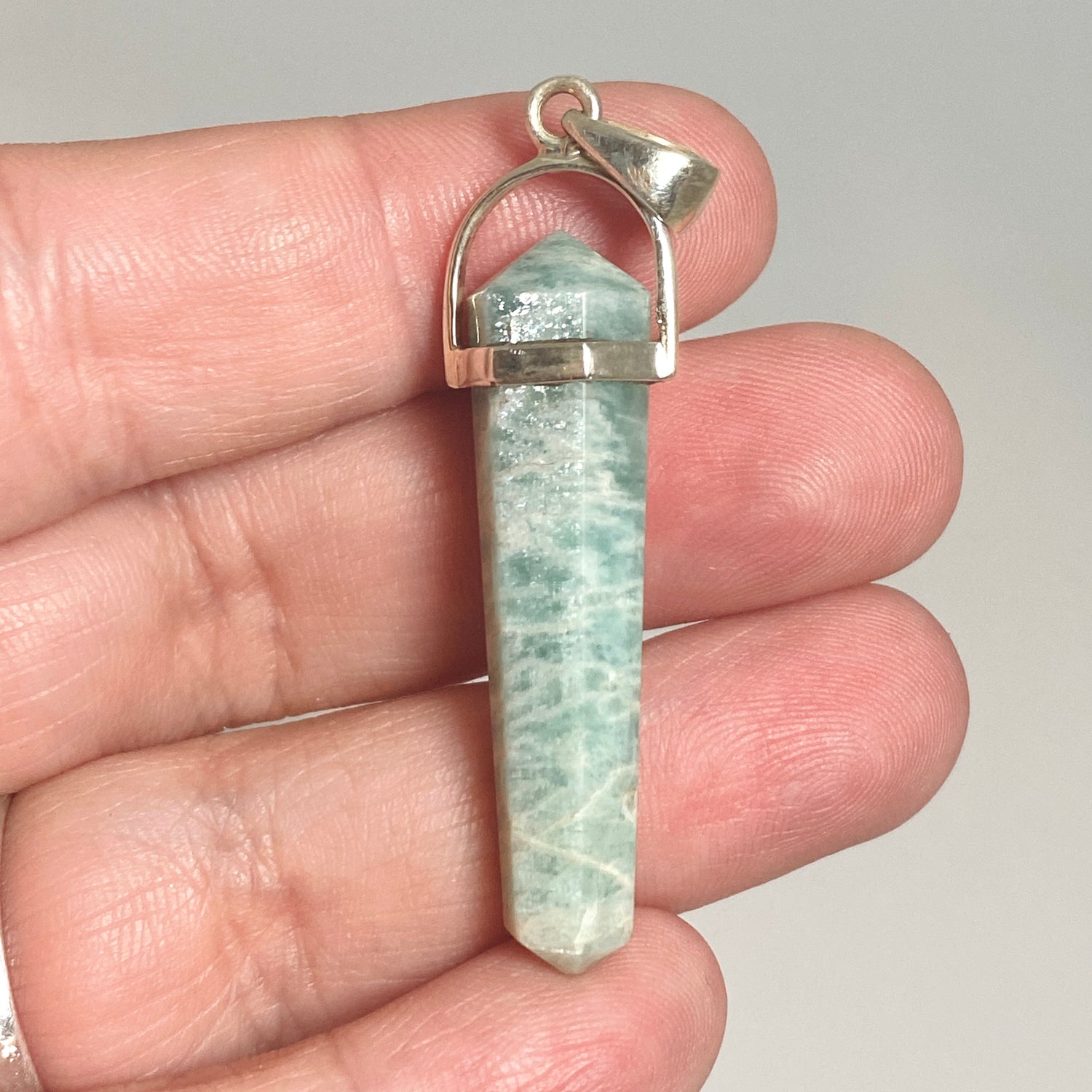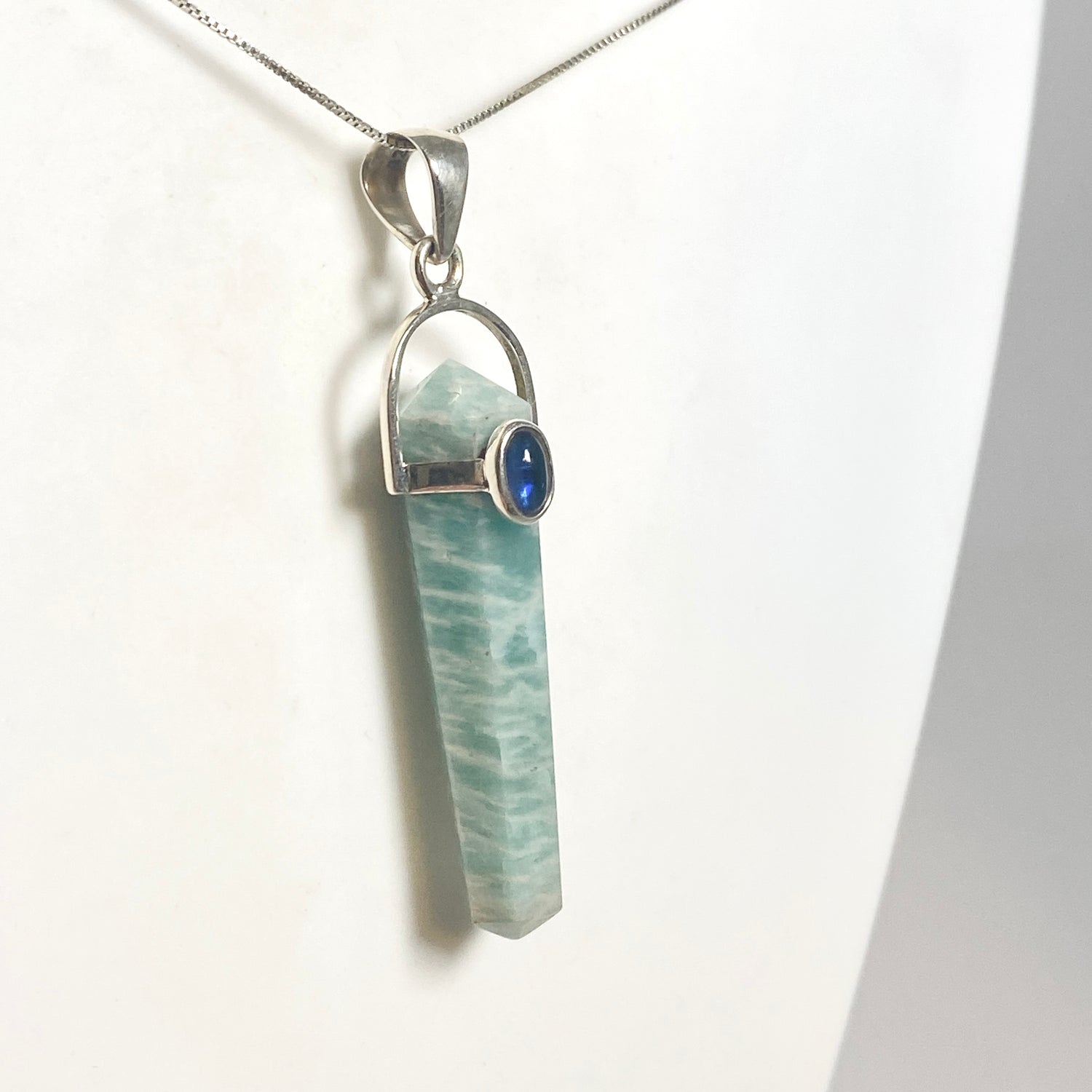 This double point Amazonite pendant is accented with Kyanite and set in sterling silver. Amazonite brings calm and emotional harmony, while Kyanite supports energetic alignment and clear communication.