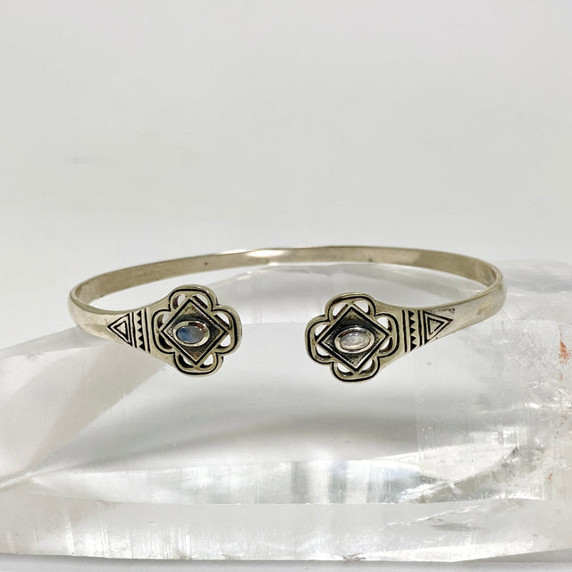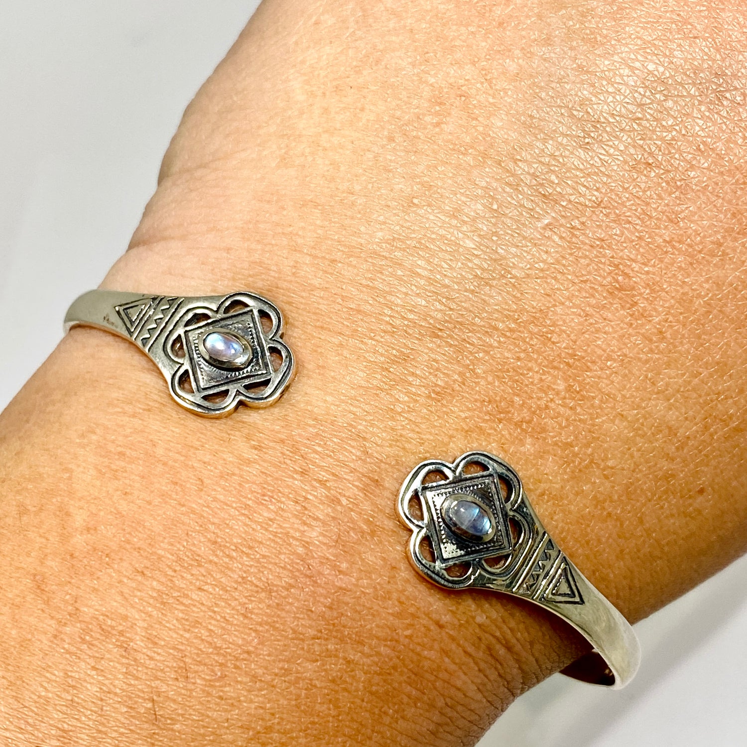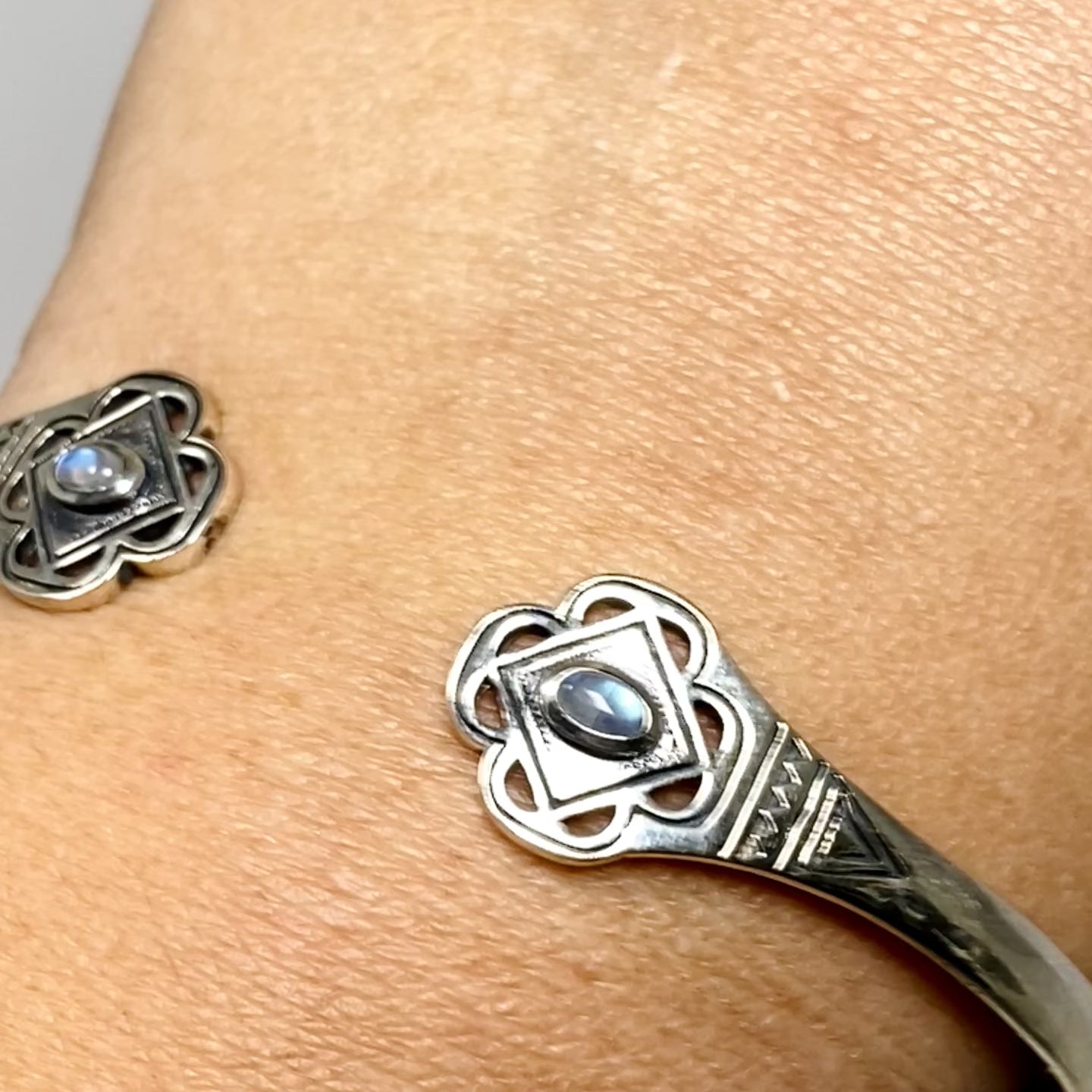 This sterling silver cuff bangle features two smooth oval Moonstone cabochons set in a decorative band. Moonstone is known for supporting emotional balance, intuition, and gentle clarity, making it a grounding yet luminous piece to wear daily. Its open cuff design ensures comfort while adding a statement of subtle elegance to any outfit.