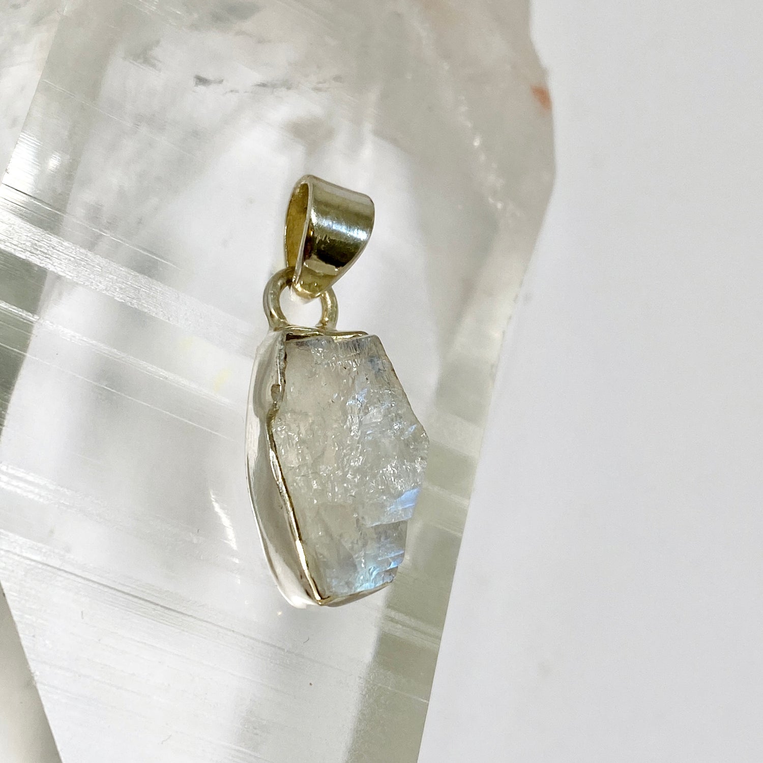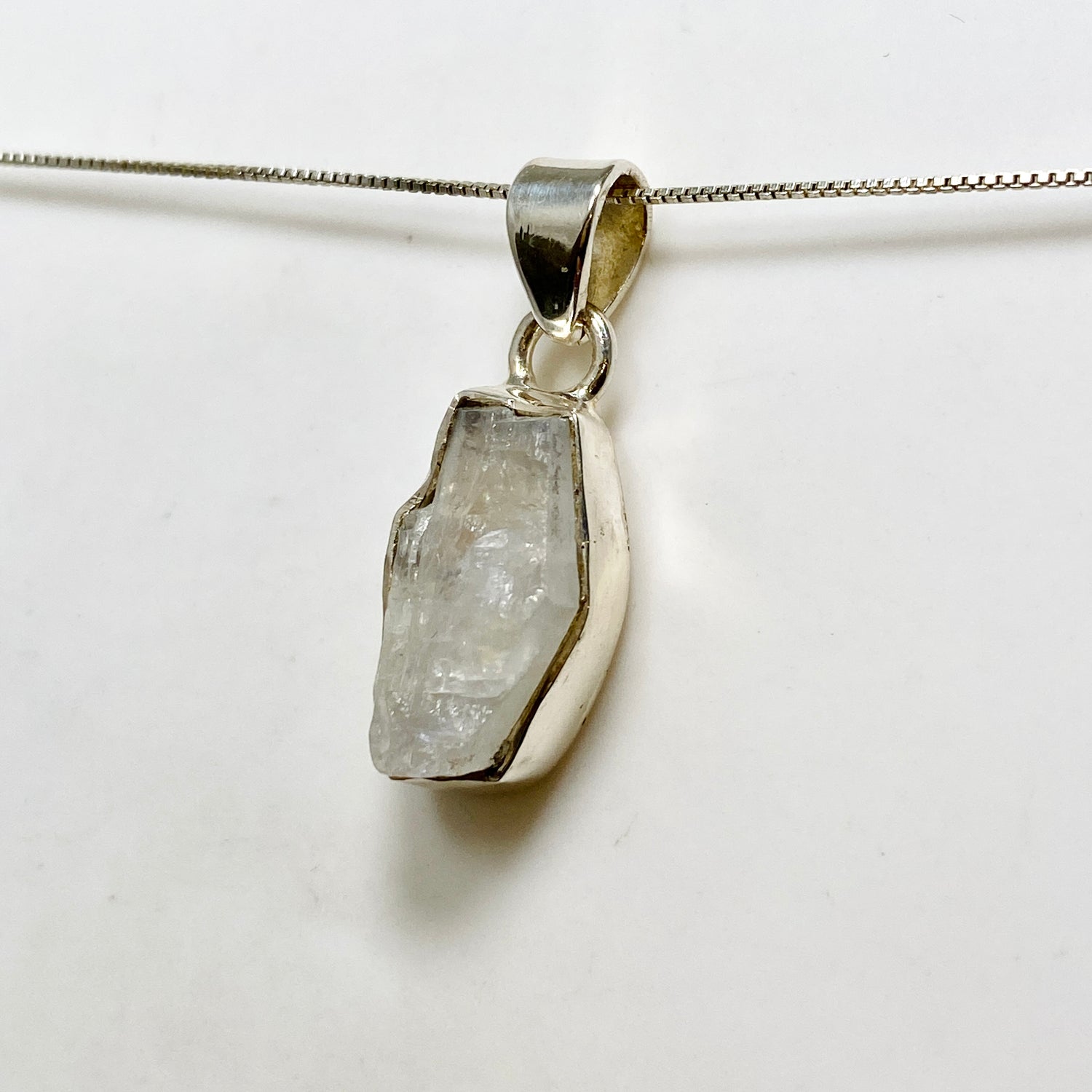A raw Moonstone crystal pendant set in sterling silver, showing the stone in its natural, unpolished form. Known for supporting emotional balance and intuition, raw Moonstone carries a grounding energy while remaining light and wearable as a statement piece.