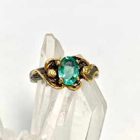 This striking sterling silver emerald ring, crafted by an European master jeweller using wax casting, features a vibrant emerald center stone, beautifully complemented by a sapphire accent and delicate 18ct gold decorative accents. The rich green of the emerald contrasts elegantly with the deep blue of the sapphire, creating a captivating focal point. The petite gold accents add a touch of luxury, while the oxidized rhodium-plated band gives the piece a vintage-inspired, darkened finish that enhances its intricate design. The combination of rich gemstones, warm gold, and the bold, oxidized band offers a sophisticated and unique look, making this ring a perfect statement piece for those who appreciate fine craftsmanship and timeless elegance.