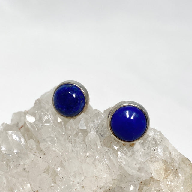 These Lapis Lazuli round cabochon stud earrings are expertly crafted with a sterling silver setting, highlighting the deep blue hues of the lapis lazuli gemstones. Each earring is a unique and stunning accessory, perfect for adding a touch of elegance to any outfit. Expertly crafted for a timeless and sophisticated look.