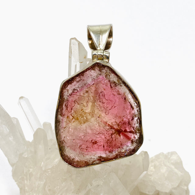 A rare combination of Pink and Gold Tourmaline, this pendant carries the soothing energy of the heart while bringing in warmth, confidence, and personal power. The natural slice cut highlights the stunning gradient of colours, making it a standout piece. Set in sterling silver, it’s a powerful talisman for those looking to attract joy and emotional harmony.