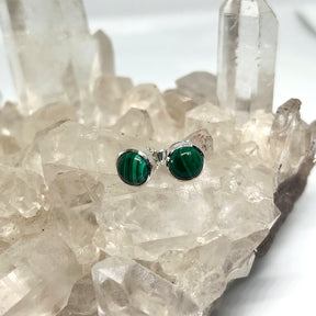 These malachite cabochon stud earrings, set in sterling silver, display the rich, vibrant green patterns of this striking gemstone. Known as the "Stone of Transformation," malachite is believed to absorb negative energy and support emotional healing. It is often used to enhance personal growth, clear blockages, and promote inner strength. The smooth cabochon cut highlights the unique swirls of green, making each pair one-of-a-kind. These earrings are perfect for those seeking both style and the powerful, transformative energy that malachite is known to provide.