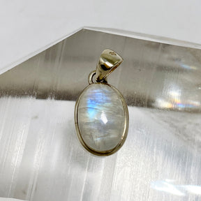 This petite sterling silver pendant features a smooth oval Moonstone cabochon, prized for its luminous adularescence. Moonstone is said to support emotional balance, intuition, and gentle clarity, making it a wearable crystal for grounding and personal insight.