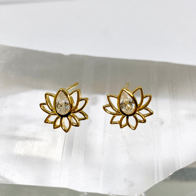 These gold plated sterling silver stud earrings feature a delicate lotus flower and a teardrop faceted cubic zirconia drop. They offer a clean, refined sparkle without being over the top. A great choice for gifting or adding a little shine to your daily style.