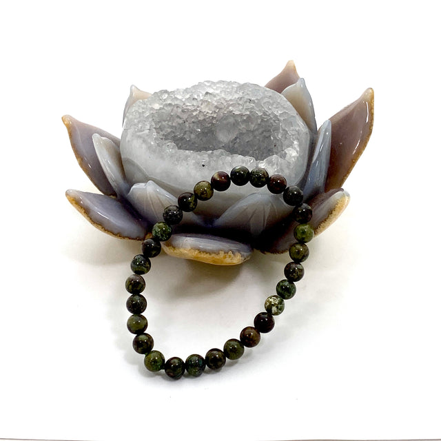 This Bastite Dragon Blood Jasper bracelet features natural 6mm beads with striking deep green and red hues, reminiscent of ancient dragon lore. Often associated with courage, strength, and vitality, Dragon Blood Jasper is a favourite for those seeking grounding energy with a touch of boldness.