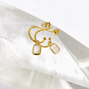 Iridescent Moonstone catches the light in these rectangular faceted half hoops. The soft glow contrasts beautifully against the warm gold plating for an elegant, dreamy finish.