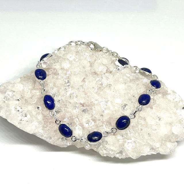 This sterling silver lapis lazuli bracelet is available in two elegant cabochon styles: oval and teardrop. Each cabochon highlights the rich, deep blue of lapis lazuli with natural golden flecks of pyrite, adding a unique sparkle and depth to the design. Known as the "Stone of Wisdom," lapis lazuli is believed to enhance mental clarity, insight, and self-expression, making it a meaningful addition to any jewellery collection. The oval cabochons offer a classic, timeless appeal, while the teardrop shape brings a refined, graceful touch. Perfect for those who appreciate both beauty and the empowering energy of lapis lazuli, this bracelet is an ideal choice for any occasion.