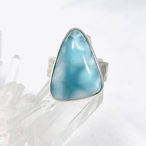 This stylish Larimar ring is crafted from 925 sterling silver and features a hammered band and a beautiful triangular-cut Larimar gemstone. The unique hammered texture of the band adds an elegant touch to any look.