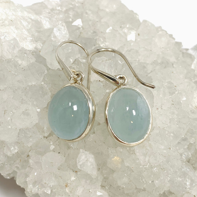 Smooth oval aquamarine cabochon earrings that highlight the stone’s soft blue tones. Aquamarine is great for calming energy and supporting clear communication.