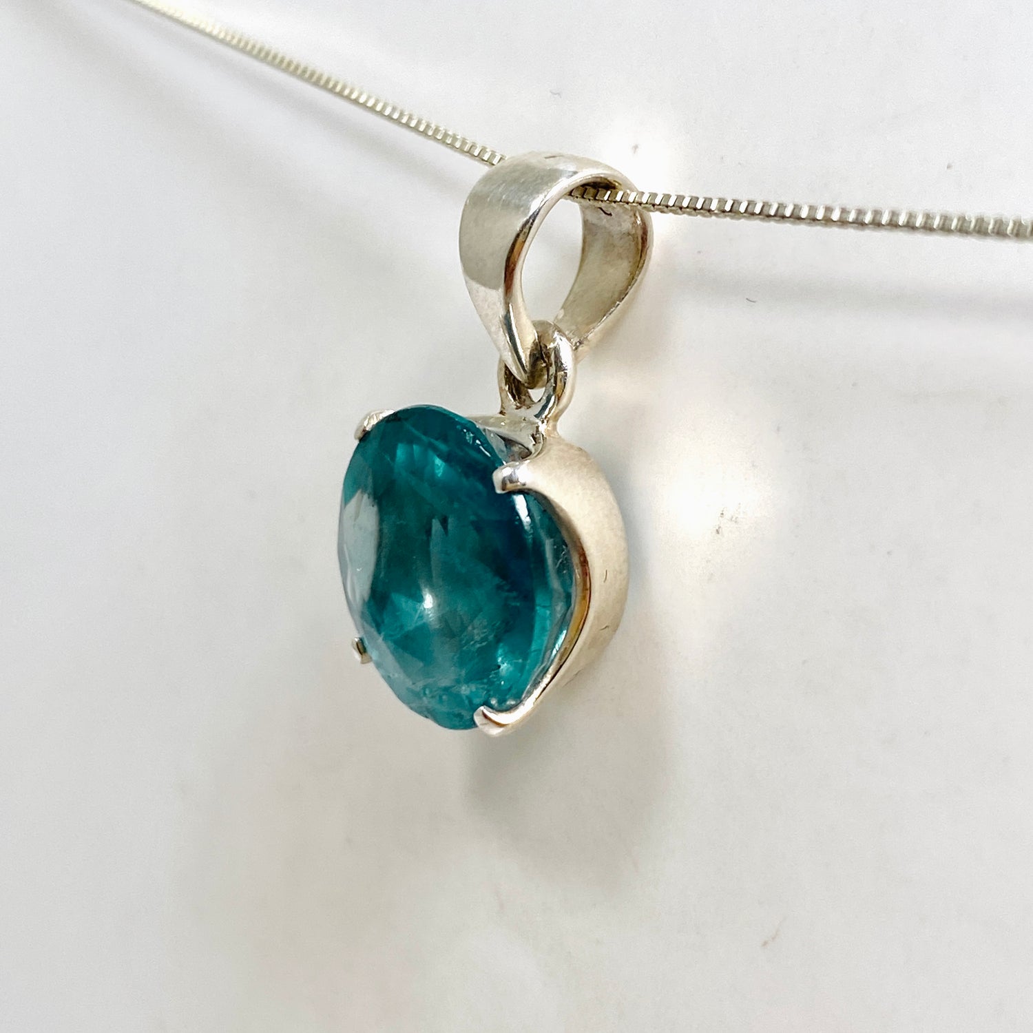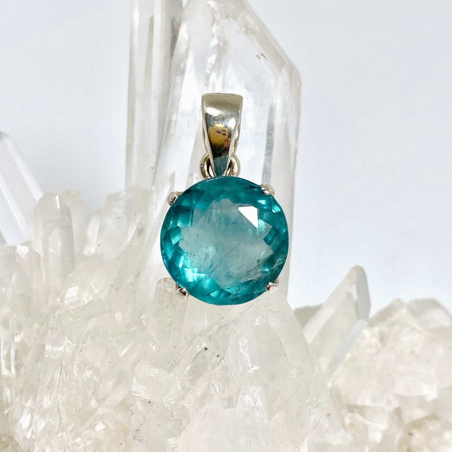 This Blue Fluorite Round Faceted Pendant, set in 925 sterling silver, promotes clear thinking, focus, and emotional stability. The round cut enhances the stone’s natural clarity and reflective qualities.