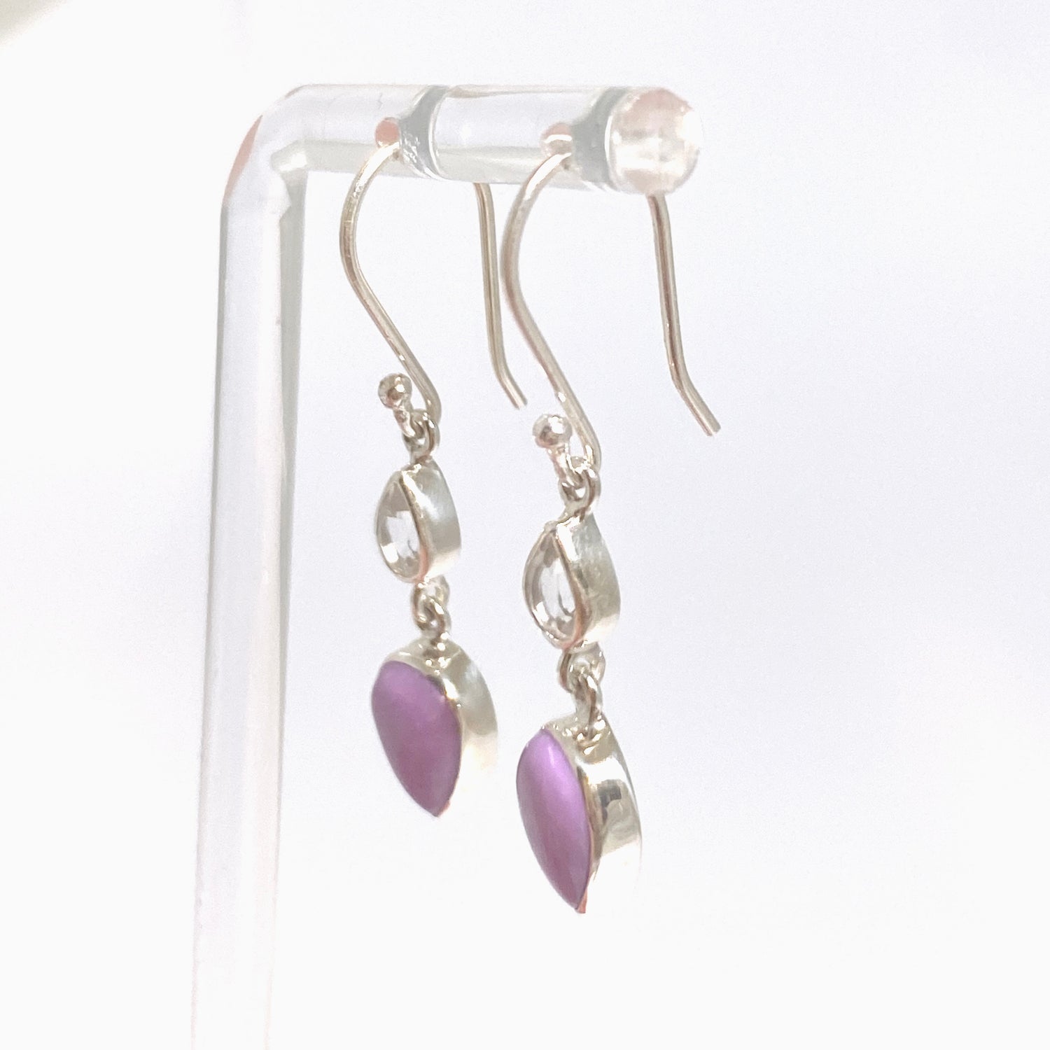 These elegant earrings feature Phosphosiderite teardrop cabochons accented with Clear Quartz, set in sterling silver. The combination offers both soothing emotional support and energetic clarity.