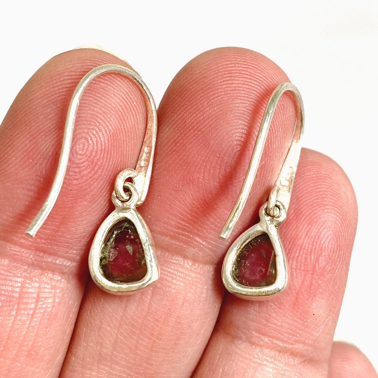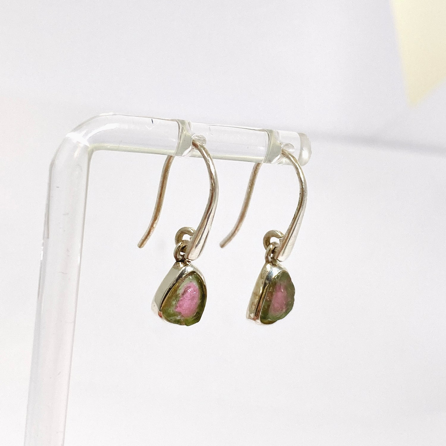 Freeform Watermelon Tourmaline earrings featuring natural pink and green colours. The stones are set in .925 sterling silver, simply supporting the crystals while highlighting their energy of balance and heart-centred healing.