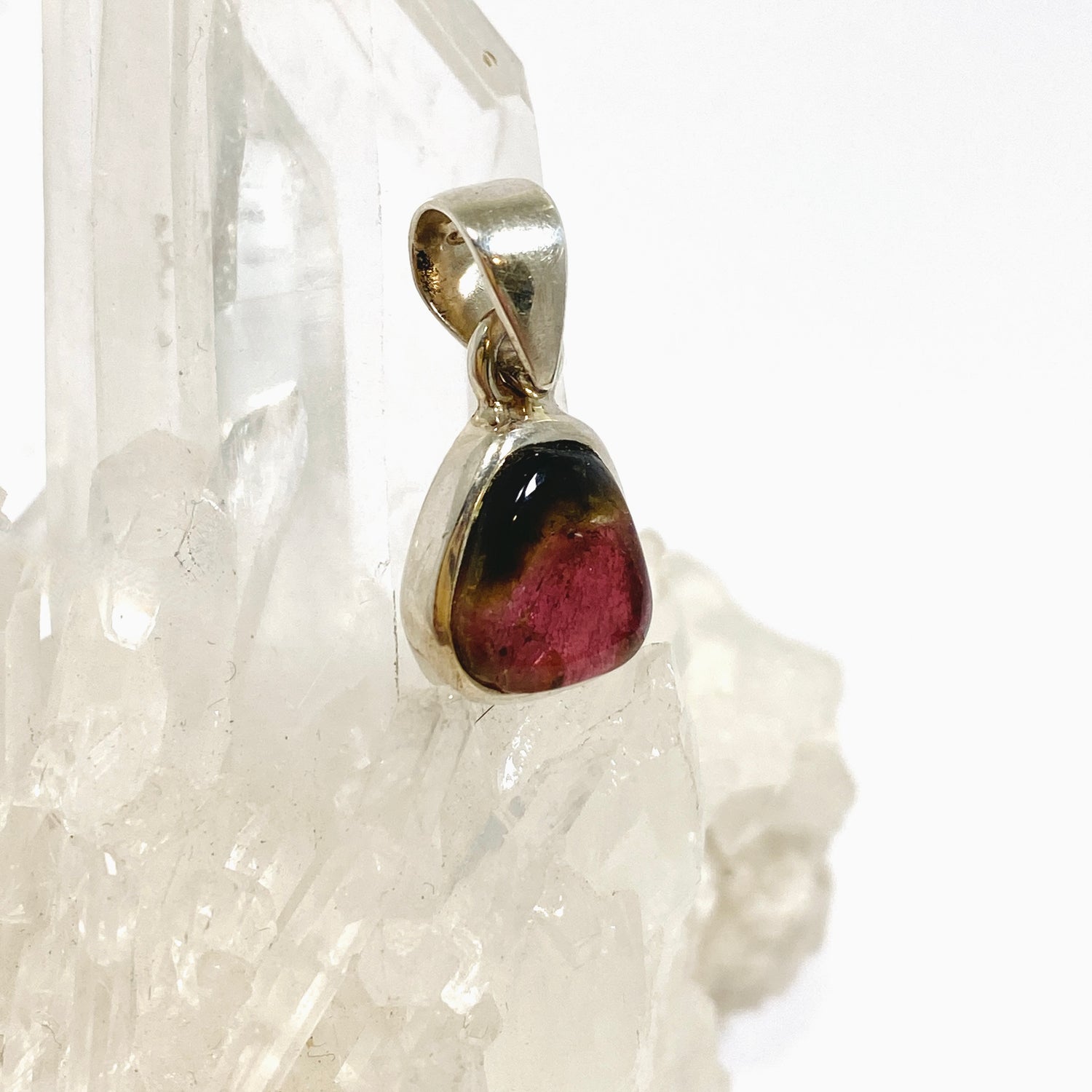 A freeform slice of Watermelon Tourmaline showing off its natural pink and green hues. Set in .925 sterling silver, the simple setting allows the stone’s unique colours and natural energy of emotional balance and heart-centred healing to take focus.