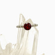 This sterling silver ring features a round faceted garnet accented with sparkling cubic zirconia, offering a blend of classic and contemporary style. Garnet is believed to stimulate past-life recall and sharpen perceptions, aiding in personal growth and self-awareness. Its energising properties can also boost motivation and drive.