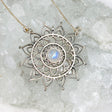 Gorgeous sterling silver Mandala necklace with a moonstone focal stone. Moonstone, known for its ethereal energies, enhances intuition and balances emotions, making this mandala an emblem of inner peace and cosmic connection.