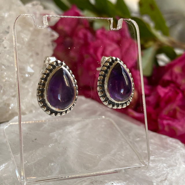 Stunning cabochon teardrop amethyst crystal stud earrings, set in sterling silver