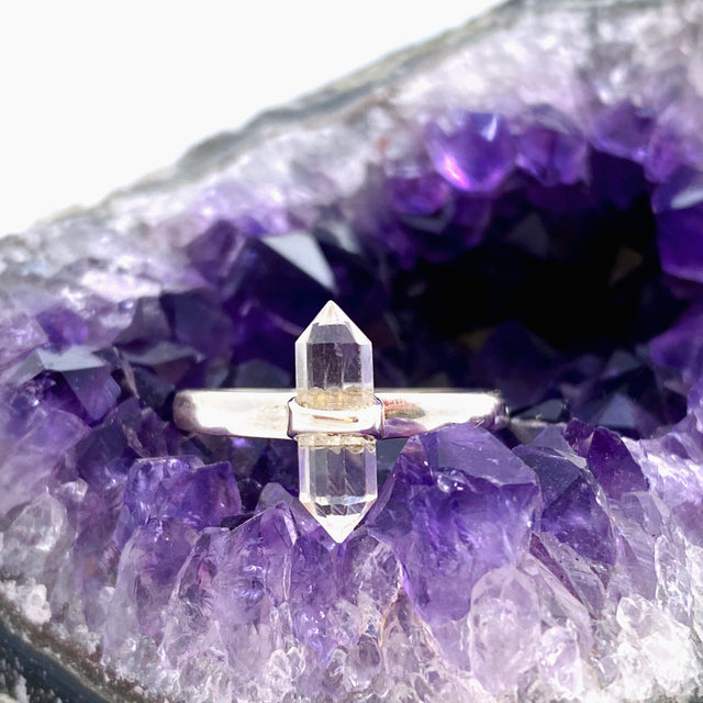 Embrace the clarity and amplifying energy of the Clear Quartz Double Point Ring. Known as the "Master Healer," Clear Quartz is revered for its ability to enhance energy flow and bring balance. This petite, striking ring features two clear quartz points that can be worn as a statement piece or to harness its healing powers.