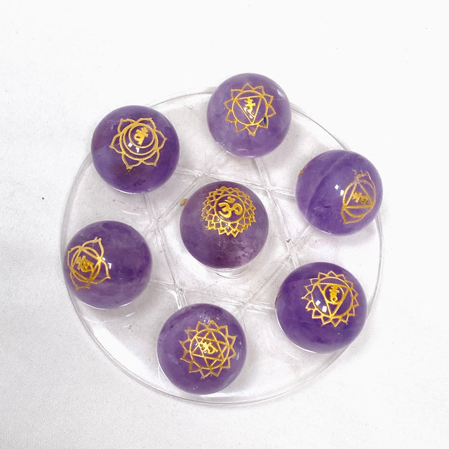 Expertly hand carved and engraved with chakra symbols, this set of amethyst spheres brings balance and harmony to your energy centers. Place them on the included acrylic grid plate for optimal healing and alignment. Own a beautiful, natural tool for enhancing your well-being.