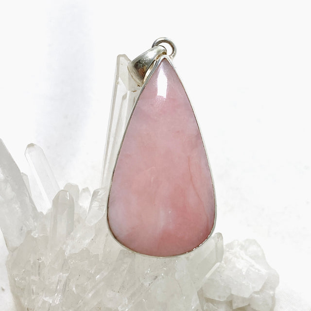 This Pink Opal Teardrop Cabochon Pendant in a Hammered Setting has a calming energy and is made of sterling silver, making it a perfect addition to any outfit.