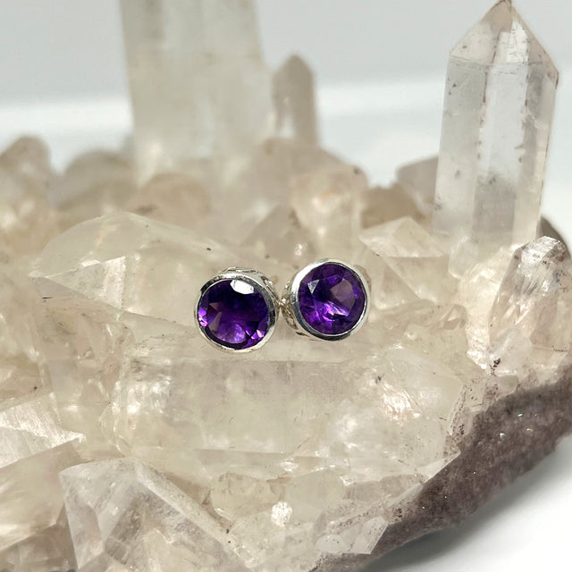 Round Faceted Gemstone Decorative Bezel Set Stud Earrings 7mm PSE001 - Amethyst is backordered and will ship as soon as it is back in stock.