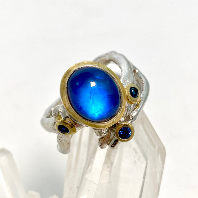 This captivating ring crafted by a master European jeweller, showcases a stunning blue Spectrolite gemstone, known for its shimmering play of iridescent colours, paired with dazzling sapphire accents. The spectrolite’s unique blue and violet hues are beautifully enhanced by the vibrant sapphires, creating a mesmerizing focal point. Set in a sterling silver band with 18ct gold-plated bezel accents, the warm gold adds a touch of luxury and sophistication. The combination of these rich gemstones and the elegant gold detailing offers a bold yet refined look, making this ring a perfect statement piece for those who appreciate both exquisite design and the natural beauty of these captivating stones.