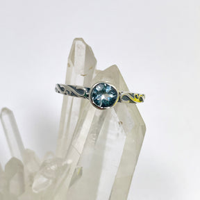 Cool and calming, this sterling silver ring features a brilliant round faceted Blue Topaz in a detailed vintage-style setting. Blue Topaz is linked with clarity, peaceful communication, and truth—making this piece both beautiful and meaningful.