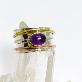 This sterling silver, brass, and copper spinner ring features a deep purple Amethyst oval cabochon, a stone known for its calming and spiritually uplifting properties. The smooth spinning bands promote relaxation and focus, making it an excellent choice for those who seek both beauty and stress relief in their jewellery.