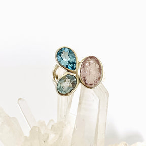 Discover the beneficial properties of gemstones when you adorn yourself with the Morganite and Blue Topaz Multi-stone Faceted Ring. Morganite is said to promote serenity and harmony, while Blue Topaz is thought to support emotional well-being.