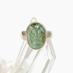 This sterling silver ring highlights a rare emerald cabochon with rutile inclusions, creating a dynamic interplay of energy. Emerald is revered for its heart-healing and spiritual insight properties, while rutile enhances focus and higher consciousness. A fascinating piece for those seeking both beauty and deeper connection.