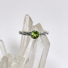 Bright and uplifting, this ring showcases a round faceted Peridot set in an intricate sterling silver design. Known for its fresh green hue and vibrant energy, Peridot is associated with renewal, abundance, and emotional balance. A stunning piece to bring light and positivity into your day.