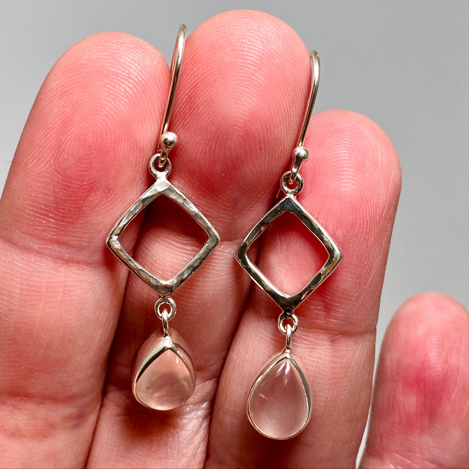 These 925 sterling silver earrings feature smooth teardrop Rose Quartz cabochons with a geometric silver drop. Rose Quartz is known for its calming and nurturing energy, said to encourage compassion and emotional healing. A graceful design that blends timeless beauty with meaningful energy.