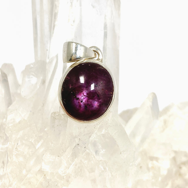 This pendant features a deep red star ruby in an oval cabochon cut, prized for its natural star-like reflection that symbolises light and guidance. Star ruby is believed to inspire determination, inner power, and spiritual protection.