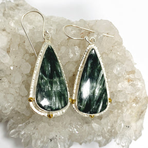 These Seraphinite teardrop cabochon earrings feature intricate sterling silver detailing that highlights the stone’s unique shimmering patterns. Seraphinite is valued for its connection to higher consciousness and inner healing. Lightweight and versatile, these earrings are perfect for everyday wear or adding a touch of nature-inspired elegance to any outfit.