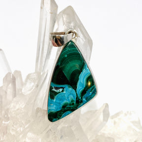 Freeform Malacholla pendant set in .925 sterling silver. Showcases unique patterns of Malachite and Chrysocolla. Supports emotional balance, calm and self-expression. Perfect for those who want a one-of-a-kind statement piece.