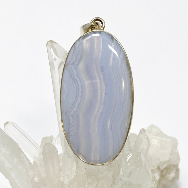A refined and elegant choice, this Blue Lace Agate oval pendant highlights the stone’s gentle blue hues and delicate banding. Set in sterling silver, this pendant is perfect for those who appreciate understated beauty and the peaceful energy of this soothing gemstone.