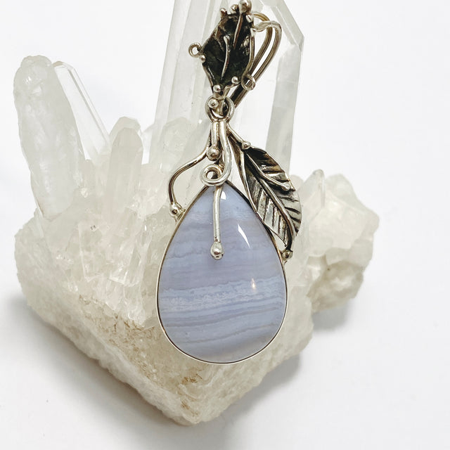 This Blue Lace Agate pendant is beautifully set in a botanical-inspired sterling silver design, blending nature’s elegance with the calming energy of this soft blue stone. The teardrop shape enhances its gentle flow of energy, making it a meaningful piece for those drawn to nature, healing, and self-expression.